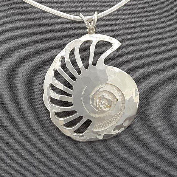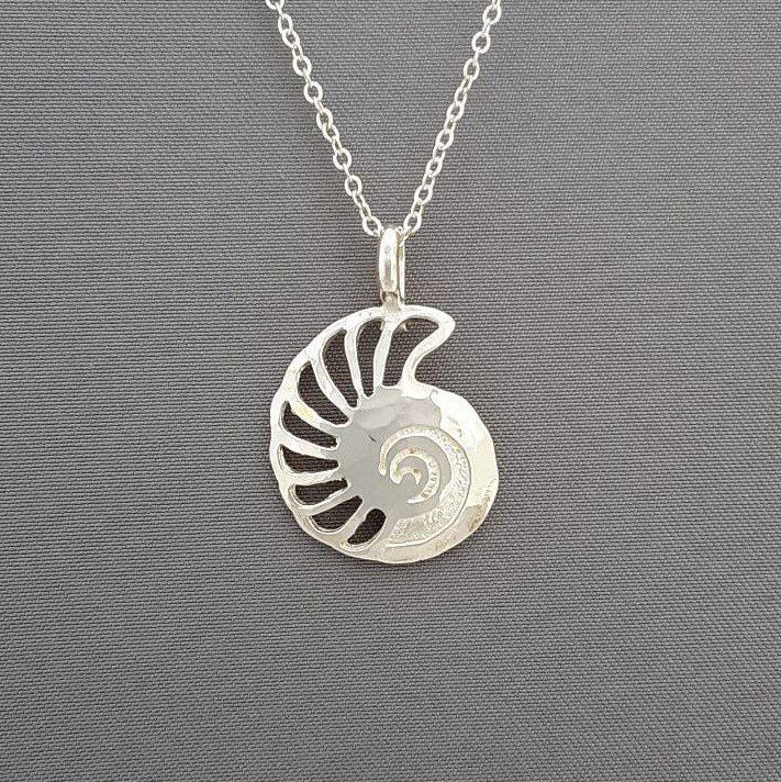 This shell is 3/4" long. The cross section of the gas chambers of the animal's shell create a treat for the eye of light and dark patterns. 18" Sterling chain included.